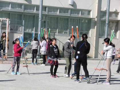 もちつきだけでなく、昔遊びもしました。けん玉・こま・羽根つき・お手玉などを地域の方や先生方に教えてもらいながら、楽しく遊びました。