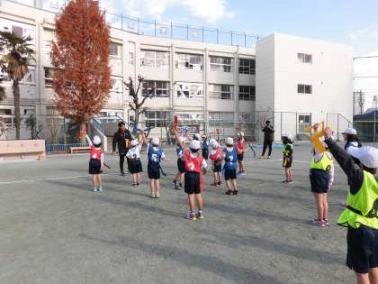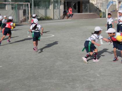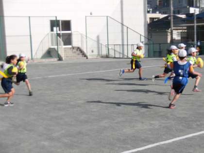 本日、リコーの方をゲストティーチャーにお招きし、タグラグビーを行いました。タグやラグビーボール型のボールを使ったゲームをしながら、運動する楽しさを味わうことができました。