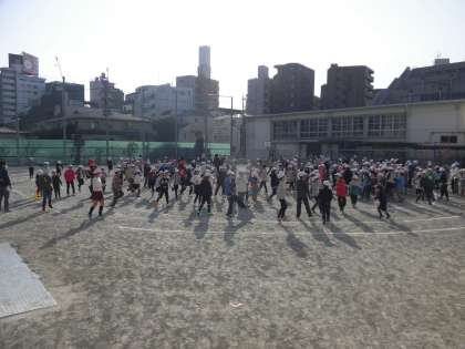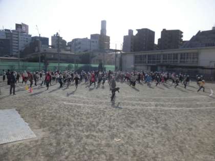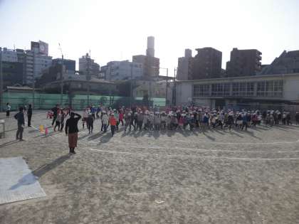 2月17日、運動集会を校庭で行いました。運動委員がおにになり、川わたりをしました。走って川わたり、スキップで川わたり、けんけんで川わたりの3種類の川わたりをしました。