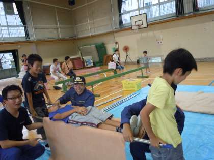 参加した子どもたちは「通報訓練」「応急タンカ」「三角巾を使った応急救護」「カレー作り」「ロープワーク」など、学年ごとに様々な体験をしました。