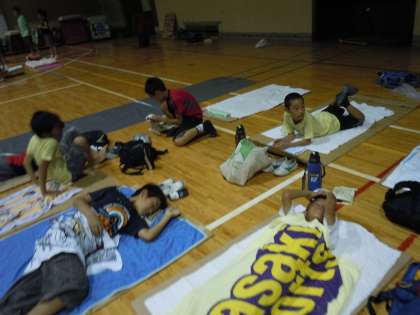 夜は4・5年生は体育館、6年生は校庭にたてたテントで寝ました。