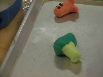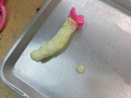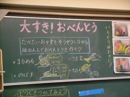 2年生がお弁当を紙ねん土で作っています。ウインナーやおにぎり、エビフライなど好きなおかずを楽しそうに作っていました。出来上がりが楽しみです。