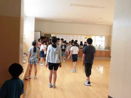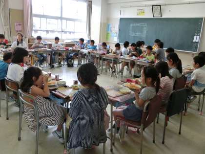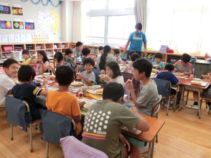 今日はたてわり班のお友達と一緒に給食を食べました。給食の準備は高学年の児童を中心に進めました。おいしい給食をいただきながら、児童の会話もはずんでいました。その後は、班ごとに交流遊びをしました。短い時間でしたが、異学年の児童が楽しく遊ぶことができました。