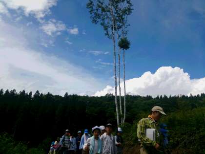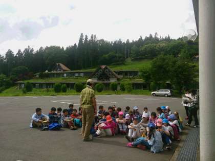 1日目。川場村は気温29℃、天気は晴れ。学園の庭でお弁当を食べてから、城山小と開室式。午後は里山を散策して、自然の勉強をしました。