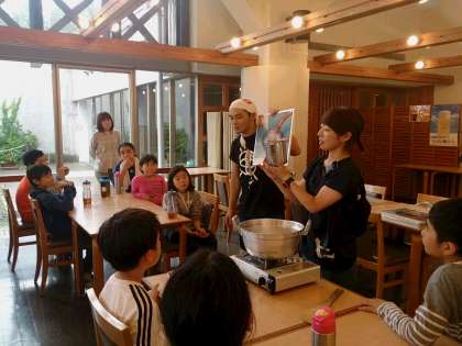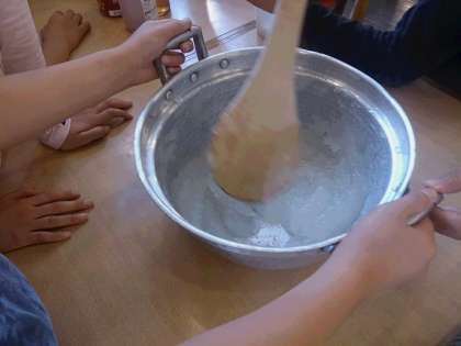 川場村は朝からあいにくの雨。山登りはできず、午前中は学年レクリエーションと、こんにゃく作りの体験学習をしました。