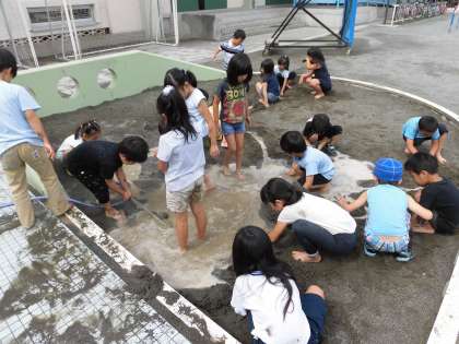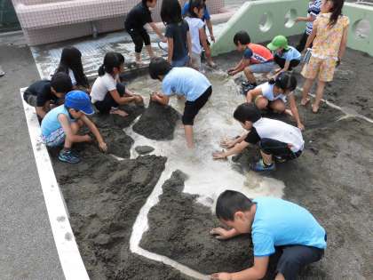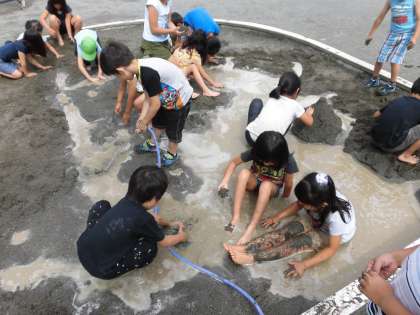 1年1組は、水曜日に砂場を使って色々な遊びを考えました。「どろがっせん」「どろぶろ」「どろうまり」「ナイル川をつくる」など意見を出し合い、校庭へと向かいました。目標はとにかくたのしむこと!夢中で泥だらけになるまで楽しみました。