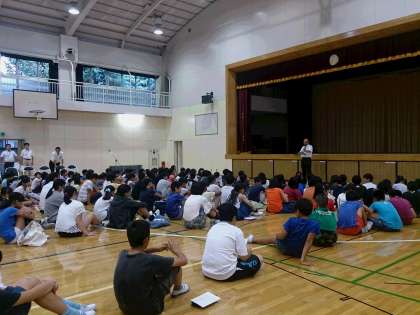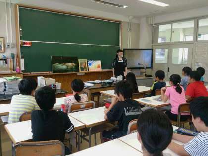 体育館で全体説明を受けたあと、クラスごとに各教室へ移動しました。三宿小は第一美術室で、美術の授業を受けます。テーマは「メッセージアート」。