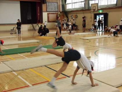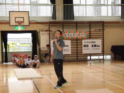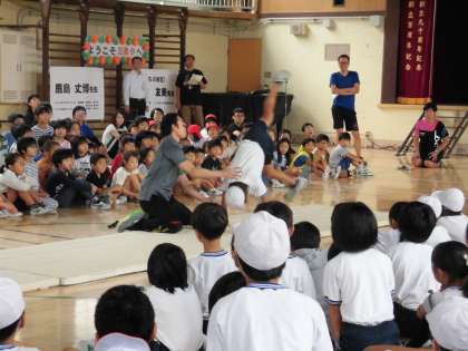 本日は、体操競技のアテネオリンピック金メダリストである鹿島丈博先生をお迎えし、特別授業を行いました。全校児童で鹿島先生がオリンピックで金メダルを獲ったときの映像を見たあと、5,6年生がマット運動の技のポイントなどを実技を通して学びました。また、「あきらめないことの大切さ」についてのお話もいただきました。学んだことを、一人一人が今後の生活に生かしてくれることに期待したいと思います。