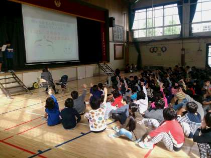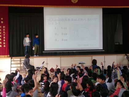 今朝は児童集会がありました。全校児童が体育館に集まり、保健給食委員会から「ハンカチ、ちりがみ調べの結果」「目の話」についての発表です。