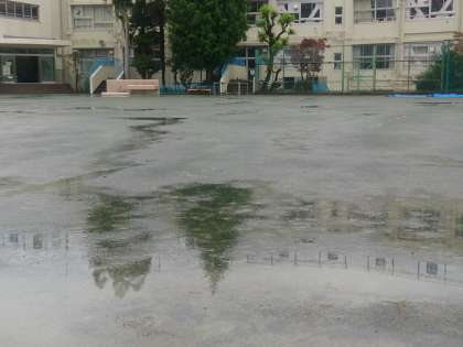 ここのところ雨の日が続いています。一度乾いた校庭も、今朝はまた水溜まりが広がっています。