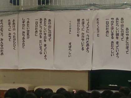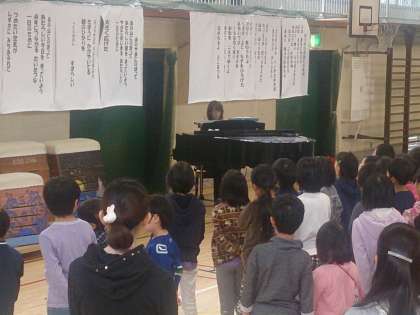 今朝は音楽朝会がありました。全校の児童が体育館に集まり、「なつのひのおくりもの」「あのやまにのぼって」の2曲を歌いました。朝の体育館は、少し肌寒く感じるようになってきました。