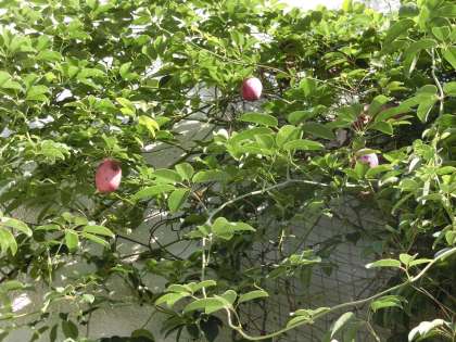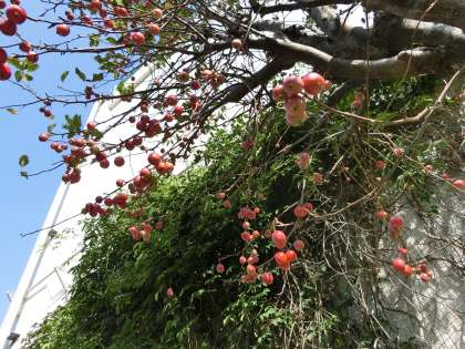 1年生が花植えを終えて緑道から帰ってくるときに、三宿小学校横から校舎を見上げると、アケビとヒメリンゴを見つけました。いつも通る道もよく見てみると「こんなところに、こんな植物が!」と発見することができるかもしれません。