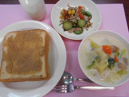 本日の給食は、セサミトースト・ミルクポトフ・りっちゃんのサラダ・牛乳です。