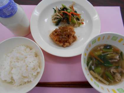 本日の給食は、ごはん・鶏肉の南蛮揚げ・小松菜のおかかあえ・沢煮椀・牛乳です。