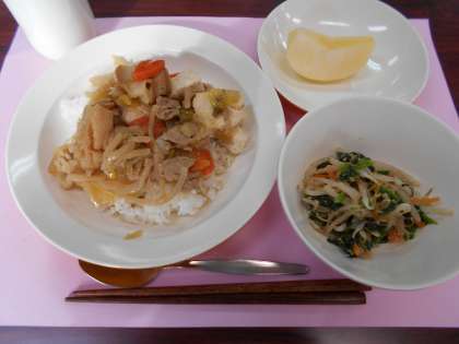 本日の給食は、すきやき丼・野菜のごまあえ・りんご・牛乳です。