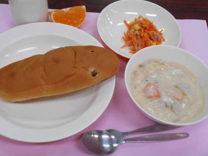 本日の給食は、ぶどうパン・クリームシチュー・にんじんサラダ・オレンジ・牛乳です。