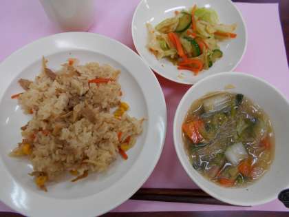 本日の給食は、中華おこわ・白菜と春雨のスープ・野菜サラダコチジャン風・牛乳です。