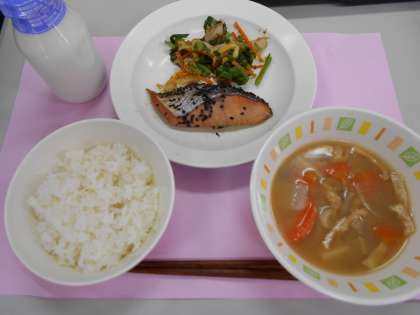 本日の給食は、ごはん・鮭の南部焼き・野菜のおかかがけ・呉汁・牛乳です。