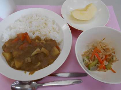 本日の給食は、シーフードカレーライス・こんにゃくサラダ・りんご・牛乳です。