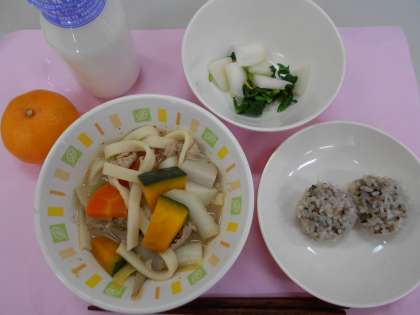 本日の給食は、ほうとう・もち米肉団子・かぶのゆずかけ・みかん・牛乳です。