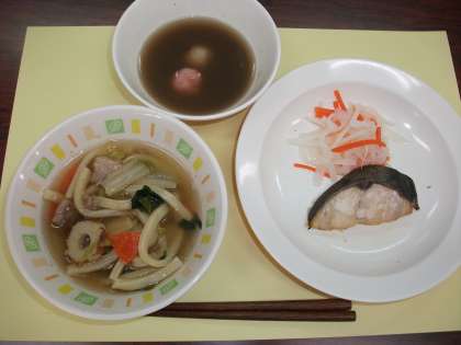 本日の給食は、ちゃんこうどん・魚の照り焼き・紅白なます・白玉しるこ・牛乳です。