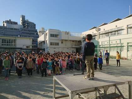 校長の講話に続いて、代表児童のスピーチを行います。今回は、1年生の2名がマイクでしっかりとスピーチを行い、みんなに大きな拍手をもらいました。