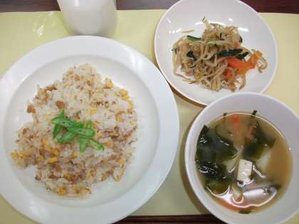 本日の給食は、三色丼・もやしと小松菜の煮びたし・じゃがいものみそ汁・牛乳です。