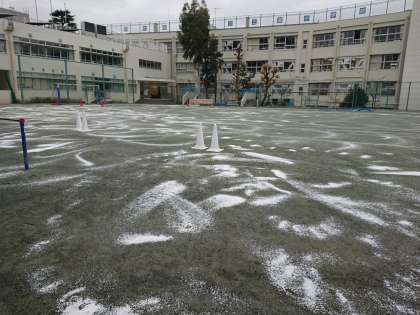 学校では、積雪後のことも考えて、朝のうちに、校庭の全面に塩化カルシウムという凍結防止剤をまきました。