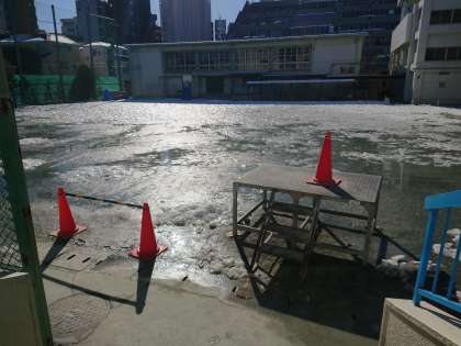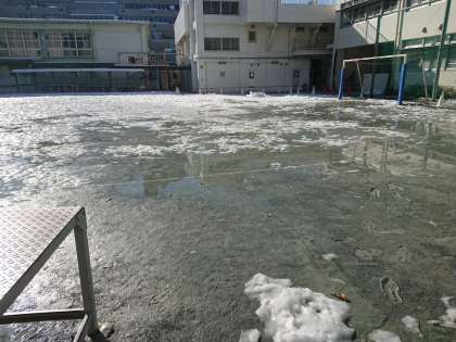 昨日子どもたちが雪遊びをした校庭は、強い日差しを浴びて、みるみるとけてきています。
