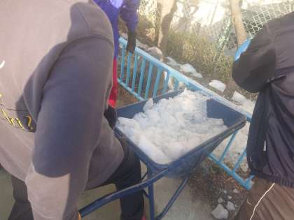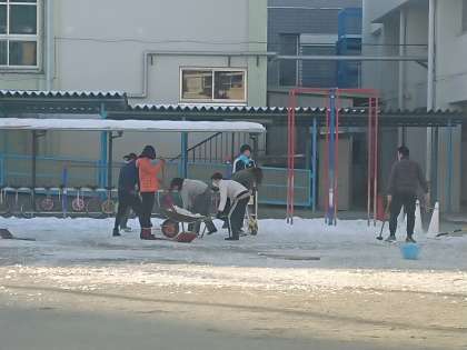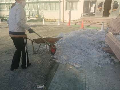 今朝は朝早くから教職員が総出で、校庭の表面を覆いつくしている氷を砕いて運び出す作業を行いました。時間の関係で最後まではやりきれませんでしたが、校庭の復旧が早まることでしょう。