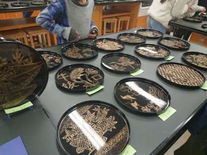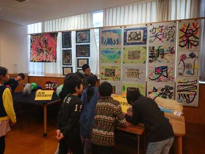 展示会場は、ランチルームをはじめとした4つの部屋に別れており、児童は中学生の技術・家庭や美術、書写、見学レポートなど多様な作品を興味深く鑑賞していました。