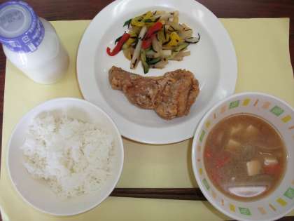 本日の給食は、ごはん・鶏肉の竜田揚げ・大根とひじきのサラダ・すりごまの味噌汁・牛乳です。