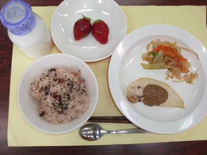 本日の給食は、赤飯・魚のごまだれかけ・野菜のおかかまぶし・くだもの(いちご)・お楽しみデザートです。