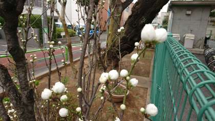 正門の横にある桃の木は、かわいい白い花を咲かせていました。学校の桜の花を見てみると、寒さのせいか、まだ1分咲きといったところでしょうか。