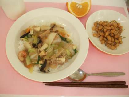 本日の給食は、中華丼・大豆とじゃこの甘辛揚げ・甘夏・牛乳です。