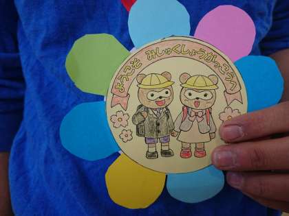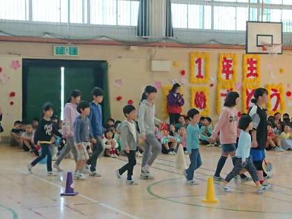 6年生に手を引かれて入場してきた1年生は、担任の先生から一人ずつ名前を呼ばれ、元気よく返事をしました。上級生がみんなで作ったメダルをプレゼントされ、最後は全員で校歌を歌いました。