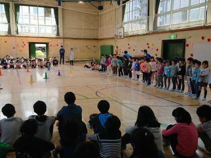 4月13日(金)の朝、全校児童が体育館に集まり、1年生おめでとう集会を行いました。