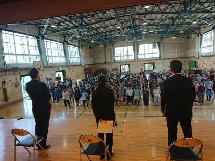 4月20日(金)の午後、離任式を行いました。参加したのは2年生以上の児童です。
