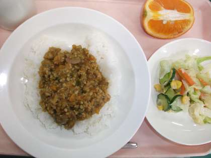 本日の給食は、ドライカレーライス・フレンチサラダ・くだもの(南津美)・牛乳です。