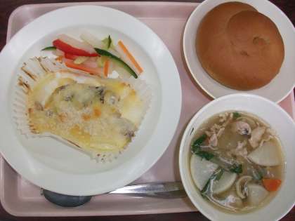 本日の給食は、黒砂糖パン・めばるのマヨネーズ焼き・大根サラダ・田舎風スープ・ジョアです。