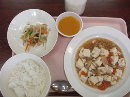 本日の給食は、ごはん・西湖豆腐・塩ナムル・もものゼリー・牛乳です。