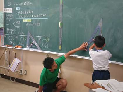 垂直な直線はどのようにかけばよいのだろうか、という課題に対し、子供たちは定規やコンパス、分度器などを使ってあれこれ考えて作図をしていました。