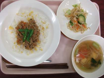 本日の給食は、とびうおそぼろ丼・野菜のからしじょうゆかけ・豆腐あんかけ汁・牛乳です。