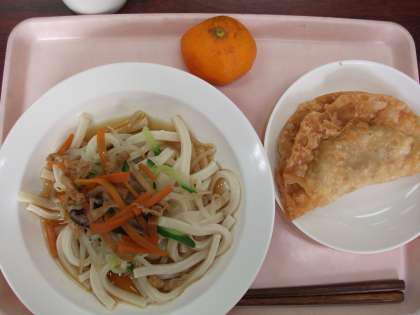 本日の給食は、冷やしつけめん・ジャンボぎょうざツナポテト味・冷凍みかん・牛乳です。