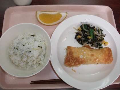 本日の給食は、わかめとじゃこのごはん・春巻き・こまつなの海苔あえ・河内晩柑・牛乳です。