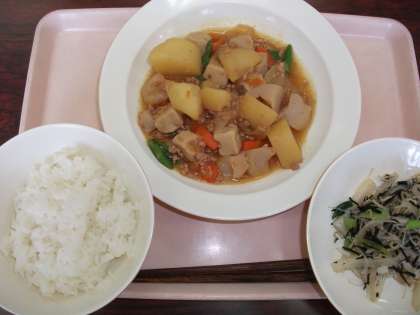 本日の給食は、ごはん・じゃがいものそぼろに・泉の学び舎鉄骨サラダ・牛乳です。