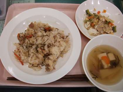 ししじゅうしいは、豚肉入りまぜごはんです。かつお出汁で炊きあげたごはんと刻み昆布がきいた具材により、旨味がつまった一品でした。