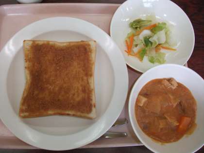 本日の給食は、きな粉バタートースト・鶏肉のトマトソース煮・キャベツサラダ・牛乳です。