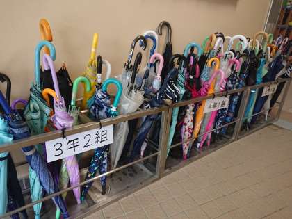 今日のように雨の日は、みんな傘を持って登校します。校舎に入ると、傘を閉じてフックをきちんと止めてから、学級ごとの傘立てに入れます。