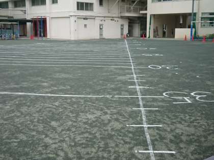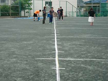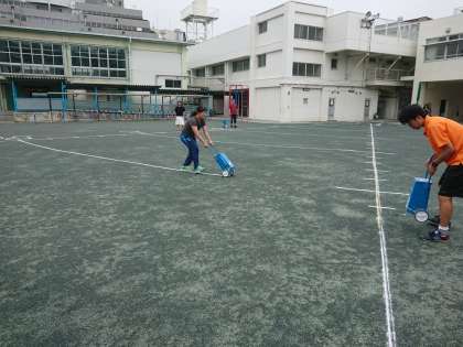 昨日の放課後に予定していたライン引きが雨のためできなかったため、急遽今朝7:30から教員有志が集まり、行いました。